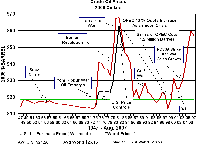 IntroductionCrude oil prices behave much as any other commodity with wide price swings in times of shortage or oversupply. The crude oil price cycle may extend over several years responding to changes in demand as well as OPEC and non-OPEC supply. The U.S. petroleum industry's price has been heavily regulated through production or price controls throughout much of the twentieth century. In the post World War II era U.S. oil prices at the wellhead averaged $24.20 per barrel adjusted for inflation to 2006 dollars. In the absence of price controls the U.S. price would have tracked the world price averaging $26.16. Over the same post war period the median for the domestic and the adjusted world price of crude oil was $18.53 in 2006 prices. That means that only fifty percent of the time from 1947 to 2006 have oil prices exceeded $18.53 per barrel. (See note in box on right.) Until the March 28, 2000 adoption of the $22-$28 price band for the OPEC basket of crude, oil prices only exceeded $24.00 per barrel in response to war or conflict in the Middle East. With limited spare production capacity OPEC abandoned its price band in 2005 and was powerless to stem a surge in oil prices which was reminiscent of the late 1970s.
