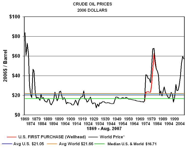 The Very Long Term ViewThe very long term view is much the same. Since 1869 US crude oil prices adjusted for inflation have averaged $21.05 per barrel in 2006 dollars compared to $21.66 for world oil prices. Fifty percent of the time prices U.S. and world prices were below the median oil price of $16.71 per barrel. If long term history is a guide, those in the upstream segment of the crude oil industry should structure their business to be able to operate with a profit, below $16.71 per barrel half of the time. The very long term data and the post World War II data suggest a "normal" price far below the current price. The results are dramatically different if only post-1970 data are used. In that case U.S. crude oil prices average $29.06 per barrel and the more relevant world oil price averages $32.23 per barrel. The median oil price for that time period is $26.50 per barrel. If oil prices revert to the mean this period is likely the most appropriate for today's analyst. It follows the peak in U.S. oil production eliminating the effects of the Texas Railroad Commission and is a period when the Seven Sisters were no longer able to dominate oil production and prices. It is an era of far more influence by OPEC oil producers than they had in the past. As we will see in the details below influence over oil prices is not equivalent to control.