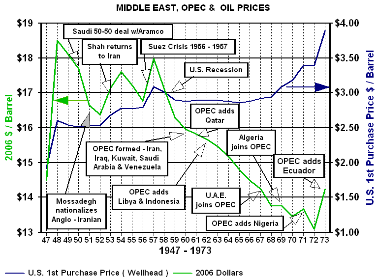 Pre Embargo PeriodCrude Oil prices ranged between $2.50 and $3.00 from 1948 through the end of the 1960s. The price oil rose from $2.50 in 1948 to about $3.00 in 1957. When viewed in 2006 dollars an entirely different story emerges with crude oil prices fluctuating between $17 - $18 during the same period. The apparent 20% price increase just kept up with inflation. From 1958 to 1970 prices were stable at about $3.00 per barrel, but in real terms the price of crude oil declined from above $17 to below $14 per barrel. The decline in the price of crude when adjusted for inflation was amplified for the international producer in 1971 and 1972 by the weakness of the US dollar. OPEC was formed in 1960 with five founding members Iran, Iraq, Kuwait, Saudi Arabia and Venezuela. Two of the representatives at the initial meetings had studied the the Texas Railroad Commission's methods of influencing price through limitations on production. By the end of 1971 six other nations had joined the group: Qatar, Indonesia, Libya, United Arab Emirates, Algeria and Nigeria. From the foundation of the Organization of Petroleum Exporting Countries through 1972 member countries experienced steady decline in the purchasing power of a barrel of oil. Throughout the post war period exporting countries found increasing demand for their crude oil but a 40% decline in the purchasing power of a barrel of oil. In March 1971, the balance of power shifted. That month the Texas Railroad Commission set proration at 100 percent for the first time. This meant that Texas producers were no longer limited in the amount of oil that they could produce. More importantly, it meant that the power to control crude oil prices shifted from the United States (Texas, Oklahoma and Louisiana) to OPEC. Another way to say it is that there was no more spare capacity and therefore no tool to put an upper limit on prices. A little over two years later OPEC would, through the unintended consequence of war, get a glimpse at the extent of its power to influence prices.