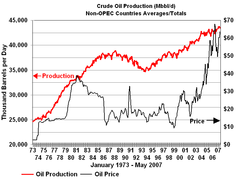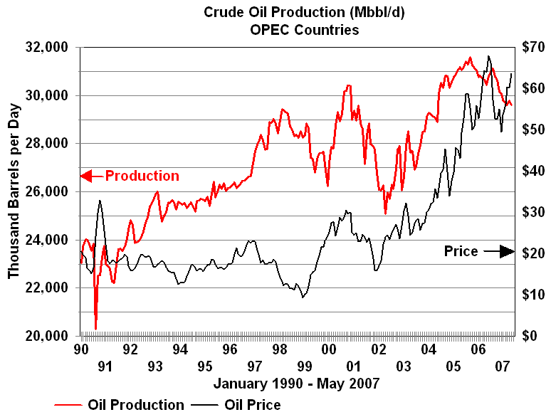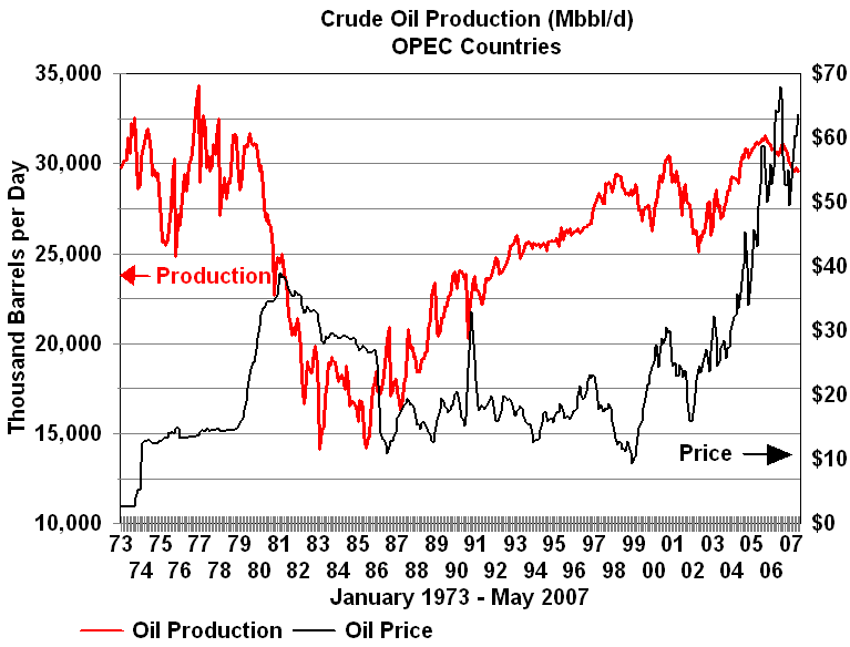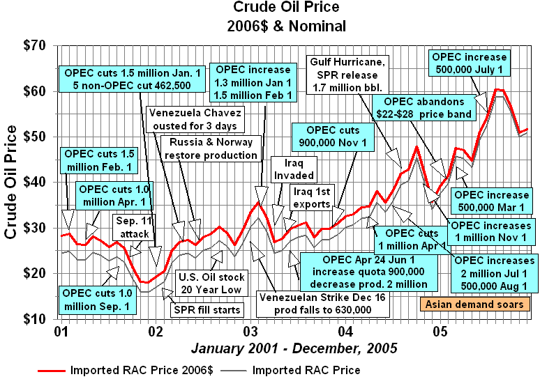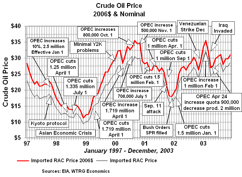 OPEC's Failure to Control Crude Oil PricesOPEC has seldom been effective at controlling prices. While often referred to as a cartel, OPEC does not satisfy the definition. One of the primary requirements is a mechanism to enforce member quotas. The old joke went something like this. What is the difference between OPEC and the Texas Railroad Commission? OPEC doesn't have any Texas Rangers! The only enforcement mechanism that has ever existed in OPEC was Saudi spare capacity. With enough spare capacity at times to be able to increase production sufficiently to offset the impact of lower prices on its own revenue, Saudi Arabia could enforce discipline by threatening to increase production enough to crash prices. In reality even this was not an OPEC enforcement mechanism unless OPEC's goals coincided with those of Saudi Arabia. During the 1979-1980 period of rapidly increasing prices, Saudi Arabia's oil minister Ahmed Yamani repeatedly warned other members of OPEC that high prices would lead to a reduction in demand. His warnings fell on deaf ears. Surging prices caused several reactions among consumers: better insulation in new homes, increased insulation in many older homes, more energy efficiency in industrial processes, and automobiles with higher efficiency. These factors along with a global recession caused a reduction in demand which led to falling crude prices. Unfortunately for OPEC only the global recession was temporary. Nobody rushed to remove insulation from their homes or to replace energy efficient plants and equipment -- much of the reaction to the oil price increase of the end of the decade was permanent and would never respond to lower prices with increased consumption of oil. Higher prices also resulted in increased exploration and production outside of OPEC. From 1980 to 1986 non-OPEC production increased 10 million barrels per day. OPEC was faced with lower demand and higher supply from outside the organization. From 1982 to 1985, OPEC attempted to set production quotas low enough to stabilize prices. These attempts met with repeated failure as various members of OPEC produced beyond their quotas. During most of this period Saudi Arabia acted as the swing producer cutting its production in an attempt to stem the free fall in prices. In August of 1985, the Saudis tired of this role. They linked their oil price to the spot market for crude and by early 1986 increased production from 2 MMBPD to 5 MMBPD. Crude oil prices plummeted below $10 per barrel by mid-1986. Despite the fall in prices Saudi revenue remained about the same with higher volumes compensating for lower prices. A December 1986 OPEC price accord set to target $18 per barrel bit it was already breaking down by January of 1987and prices remained weak. The price of crude oil spiked in 1990 with the lower production and uncertainty associated with the Iraqi invasion of Kuwait and the ensuing Gulf War. The world and particularly the Middle East had a much harsher view of Saddam Hussein invading Arab Kuwait than they did Persian Iran. The proximity to the world's largest oil producer helped to shape the reaction. Following what became known as the Gulf War to liberate Kuwait crude oil prices entered a period of steady decline until in 1994 inflation adjusted prices attained their lowest level since 1973. The price cycle then turned up. The United States economy was strong and the Asian Pacific region was booming. From 1990 to 1997 world oil consumption increased 6.2 million barrels per day. Asian consumption accounted for all but 300,000 barrels per day of that gain and contributed to a price recovery that extended into 1997. Declining Russian production contributed to the price recovery. Between 1990 and 1996 Russian production declined over 5 million barrels per day. OPEC continued to have mixed success in controlling prices. There were mistakes in timing of quota changes as well as the usual problems in maintaining production discipline among its member countries. The price increases came to a rapid end in 1997 and 1998 when the impact of the economic crisis in Asia was either ignored or severely underestimated by OPEC. In December, 1997 OPEC increased its quota by 2.5 million barrels per day (10 percent) to 27.5 MMBPD effective January 1, 1998. The rapid growth in Asian economies had come to a halt. In 1998 Asian Pacific oil consumption declined for the first time since 1982. The combination of lower consumption and higher OPEC production sent prices into a downward spiral. In response, OPEC cut quotas by 1.25 million b/d in April and another 1.335 million in July. Price continued down through December 1998. Prices began to recover in early 1999 and OPEC reduced production another 1.719 million barrels in April. As usual not all of the quotas were observed but between early 1998 and the middle of 1999 OPEC production dropped by about 3 million barrels per day and was sufficient to move prices above $25 per barrel. With minimal Y2K problems and growing US and world economies the price continued to rise throughout 2000 to a post 1981 high. Between April and October, 2000 three successive OPEC quota increases totaling 3.2 million barrels per day were not able to stem the price increases. Prices finally started down following another quota increase of 500,000 effective November 1, 2000. Russian production increases dominated non-OPEC production growth from 2000 forward and was responsible for most of the non-OPEC increase since the turn of the century. Once again it appeared that OPEC overshot the mark. In 2001, a weakened US economy and increases in non-OPEC production put downward pressure on prices. In response OPEC once again entered into a series of reductions in member quotas cutting 3.5 million barrels by September 1, 2001. In the absence of the September 11, 2001 terrorist attack this would have been sufficient to moderate or even reverse the trend. In the wake of the attack crude oil prices plummeted. Spot 