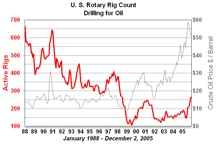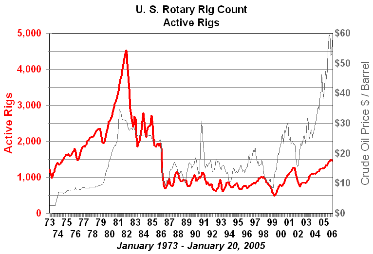 Boom and BustThe Rotary Rig Count is the average number of drilling rigs actively exploring for oil and gas. Drilling an oil or gas well is a capital investment in the expectation of returns from the production and sale of crude oil or natural gas. Rig count is one of the primary measures of the health of the exploration segment of the oil and gas industry. In a very real sense it is a measure of the oil and gas industry's confidence in its own future. At the end of the Arab Oil Embargo in 1974 rig count was below 1500. It rose steadily with regulated crude oil prices to over 2000 in 1979. From 1978 to the beginning of 1981 domestic crude oil prices exploded from a combination of the the rapid growth in world energy prices and deregulation of domestic prices. At that time high prices and forecasts of crude oil prices in excess of $100 per barrel fueled a drilling frenzy. By 1982 the number of rotary rigs running had more than doubled. It is important to note that the peak in drilling occurred over a year after oil prices had entered a steep decline which continued until the 1986 price collapse. The one year lag between crude prices and rig count disappeared in the 1986 price collapse. For the next few years the economy of the towns and cities in the oil patch was characterized by bankruptcy, bank failures and high unemployment.