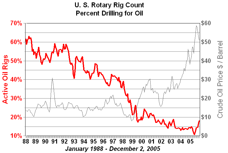 In spite of all of these efforts the percentage of rigs employed in drilling for crude oil decreased from over 60 percent of total rigs at the beginning of 1988 to under 15 percent until a recent resurgence.