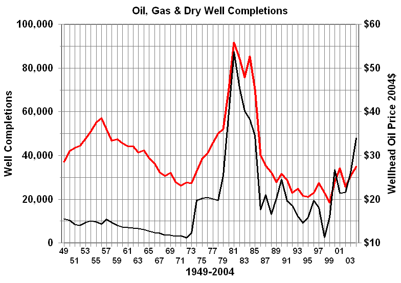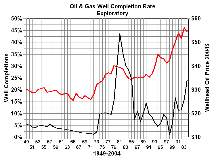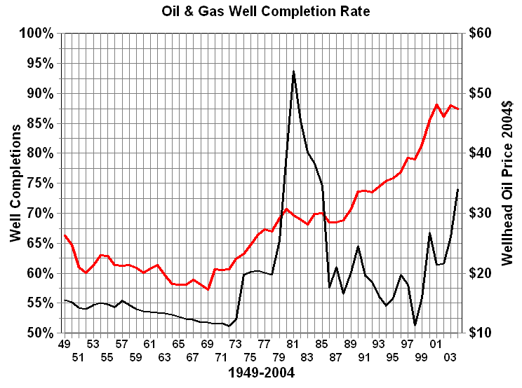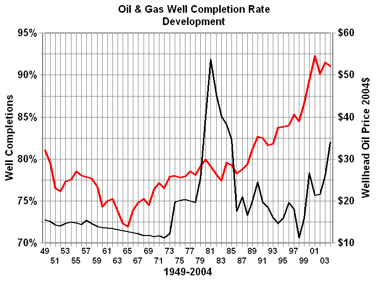 Well Completions - A measure of success?Rig count does not tell the whole story of oil and gas exploration and development. It is certainly a good measure of activity, but it is not a measure of success. After a well is drilled it is either classified as an oil well, natural gas well or dry hole. The percentage of wells completed as oil or gas wells is frequently used as a measure of success. In fact, this percentage is often referred to as the success rate. Immediately after World War II 65 percent of the wells drilled were completed as oil or gas wells. This percentage declined to about 57 percent by the end of the 1960s. It rose steadily during the 1970s to reach 70 percent at the end of that decade. This was followed by a plateau or modest decline through most of the 1980s. Beginning in 1990 shortly after the harsh lessons of the price collapse completion rates increased dramatically to 77 percent. What was the reason for the dramatic increase? For that matter, what was the cause of the steady drop in the 1950s and 1960s or the reversal in the 1970s? Since the percentage completion rates are much lower for the more risky exploratory wells, a shift in emphasis away from development would result in lower overall completion rates. This, however, was not the case. An examination of completion rates for development and exploratory wells shows the same general pattern. The decline was price related as we will explain later. Some would argue that the periods of decline were a result of the fact that every year there is less oil to find. If the industry does not develop better technology and expertise every year, oil and gas completion rates should decline. However, this does will not explain the periods of increase. The increases of the seventies were more related to price than technology. When a well is drilled, the fact that oil or gas is found does not mean that the well will be completed as a producing well. The determining factor is economics. If the well can produce enough oil or gas to cover the additional cost of completion and the ongoing production costs it will be put into production. Otherwise, its a dry hole even if crude oil or natural gas is found. The conclusion is that if real prices are increasing we can expect a higher percentage of successful wells. Conversely if prices are declining the opposite is true. The increases of the 1990s, however, cannot be explained by higher prices. These increases are the result of improved technology and the shift to a higher percentage of natural gas drilling activity. The increased use of and improvements to 3-D seismic data and analysis combined with horizontal and and directional drilling improve prospects for successful completions. The fact that natural gas is easier to see in the seismic data adds to that success rate. Most dramatic is the improvement in the the percentage exploratory wells completed. In the 1990s completion rates for exploratory wells have soared from 25 to 45 percent.