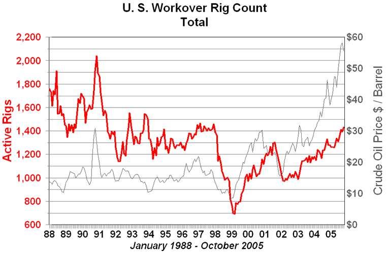 Workover Rigs - MaintenanceWorkover rig count is a measure of the industry's investment in the maintenance of oil and gas wells. The Baker-Hughes workover rig count includes rigs involved in pulling production tubing, sucker rods and pumps from a well that is 1,500 feet or more in depth. Workover rig count is another measure of the health of the oil and gas industry. A disproportionate percentage of workovers are associated with oil wells. Workover rigs are used to pull tubing for repair or replacement of rods, pumps and tubular goods which are subject to wear and corrosion. A low level of workover activity is particularly worrisome because it is indicative of deferred maintenance. The situation is similar to the aging apartment building that no longer justifies major renovations and is milked as long as it produces a positive cash flow. When operators are in a weak cash position workovers are delayed as long as possible. Workover activity impacts manufacturers of tubing, rods and pumps. Service companies coating pipe and other tubular goods are heavily affected.