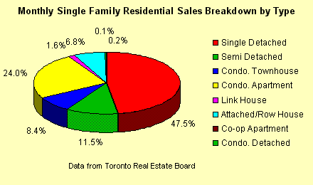 Home Sales by Type of Property: The majority of homes in Toronto being sold are single detached or semi detached, but there is a rising trend towards condos because of long commute times. (Toronto has the worst commute times in North America.) Condo townhouses are also a rising trend, but not nearly as much at the apartment-style condos.