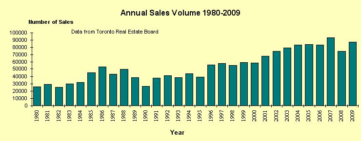 Annual Sales Volume 1980-2009: This chart shows the volume of single family homes sold between 1980 and 2009. The low volume in 1990 was due to a recession. In 1993 Jean Chretien's Liberals were elected and an economic boom in Canada grew with sales picking up dramatically in 1996. 2007 saw record sales of homes, followed by a decline during the American Recession in 2008-2009.