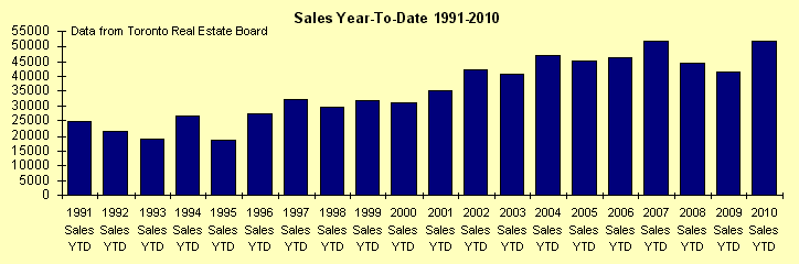 Sales Year-To-Date (January to June): Following the recession in 1990 the number of resale homes spiked dramatically as the economic boom of the Chretien era saw many families cashing in their homes and upping the ante, creating a solid period with a large volume of home resales. This chart shows the number of resales each year, up to the end of June. (Spring is the busiest time of year for home sales.)