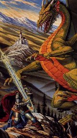 Sir Agathor (played by Bob) is attacked by a red dragon who is threatening to burn down Sir Agathor's church. Sir Agathor swings his sword (Bob rolls a d20) and rolls a 18. Sir Agathor has a +2 bonus on his strength and is carrying a magical +2 longsword. Because he has a +2 strength and a +2 sword, he gets +4 to hit the dragon. 18+4 = 22. This particular dragon gets hit whenever someone rolls a 19 or higher. Voila! Sir Agathor hit the dragon... his longsword does 5 points of damage +2 for his strength and another +2 for his magical sword. The dragon takes 9 points of damage total, but is not dead and can still burn poor Sir Agathor to death with his fiery breath.