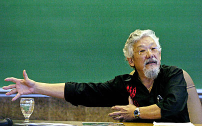 Dr. David Suzuki on...communities: “It’s at the local level that things are really happening, and usually because it’s being driven by necessity. [Municipalities] are finding they can save a huge amount of money by being much more efficient. In every community across the country we should be sitting down and saying why do we live here? What is it about this place that we love, and what do we want this place to be in 30 or 40 years? City councils become cheerleaders for developers because it brings dollars into the coffers. But in the process it often destroys the very reasons people live in those local communities.” Dr. David Suzuki on...Canadian policies: “The environment has become a number one issue. So suddenly (Prime Minister Stephen) Harper is singing green as can be. The question is, what’s going to happen after the election? “I don’t see among any of them a real sense of the urgency. This is not just some crisis we can throw a bit of money at. “If the Tories are serious they first have to spend serious time developing an energy plan with environmentalists and then they’ve got to legislate targets and timelines. They’ve got to start using taxation seriously. If they don’t like the word carbon tax, call it polluters pay. The reason the Liberals failed is because they were under such pressure from the auto sector and the fossil fuel sector. They gave in all the way.” Dr. David Suzuki on...individuals: “We have been afflicted with an increased appetite for consumption. The average family has decreased by 50 per cent and the average home has doubled in size,” he said. “It’s a lunatic notion that growth is the be all and end all. The biosphere is the reality in which we live and we’ve filled it up. We’re using up the rightful legacy of you young people in this room. That’s the grand idea of growth.”