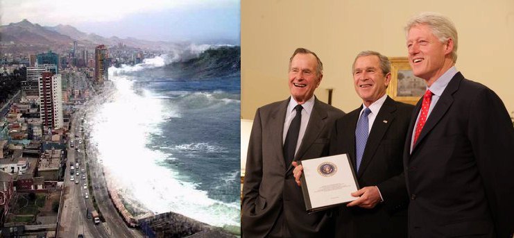 Indian Ocean TsunamiOn January 1st 2004 a huge tsunami rocked the Indian Ocean, killing approx. 225,000 people in Indonesia and nearby countries and millions of people were homeless. George W. Bush said the earthquake/tsunami was a "terrible loss of life and suffering" and initially cobbled together a $15 million aid package, a mere pittance (the Republicans reportedly spend $30 million just on inauguration ceremonies). Due to criticism of being stingy when compared to other countries (Australia pledged $819.9 million, Germany $660 million, Japan $500 million, Canada $343 million, etc.) the Bush Administration eventually increased their commitment to $350 million and raised another $350 million through donations. Bush named his two immediate predecessors, Bill Clinton and George H. W. Bush, to head up the national campaign to gather donations for tsunami victims.