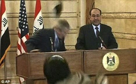 "You work three jobs? … Uniquely American, isn't it? I mean, that is fantastic that you're doing that." Financial BailoutOne of the last meaningful things George W. Bush did while he was still in power was push through a bailout of the American investment bank and mortgage industry. On paper it was effectively a loan to the biggest banks in the United States, but in essence it was the nationalization of the investment banking industry (a rather radical and communist idea). With the investment banking and mortgage industry now under government control the White House / Congress can now firmly regulate the industry, without the need to pass regulations through the government. The financial bailout was both highly supported and highly criticized by members of Congress, the House of Representatives and economists, but was seen as a necessary step to prevent millions of Americans from losing their homes in the biggest mortgage meltdown in American history. The average American's house during this period lost 40% of its listed value and many banks were refusing to refinance bad mortgages. Without the financing, homeowners would have lost their homes, the houses would end up belonging to the bank and the bank would have to sell the houses at a financial loss. By stepping in with the bailout money Bush bought up all the bad mortgages and put them under federal control, stopping the landslide of bad mortgages that was bankrupting the banking industries. Or was it? The financial sector's profits were down, but not all of them were dire. Most of them were just reporting a loss of 20 to 30% in profit margins, money which typically goes back to their stock holders and pays out huge bonuses. They were still making profits and the bailout wasn't really as necessary for some of the corporations which were just seeing less profits as opposed to looking at bankruptcy. After the bailout was successful the industry kept paying outrageous bonuses to their executives (in 2008 AIG paid $165 million in bonuses, funded by American taxpayers). In March 2009 Congress put a stop to that however by taxing (up to 100%) the bonuses of every company that received bailout cash. The financial bailout was necessary, but it was badly planned and organized. A lot of the companies that received cash didn't really need it. Laissez-faire proponents also criticized the bailout for too much government intervention and control, believing it would hurt the economy, while other economists criticized the bailout for ballooning the US National Debt. Shoe Throwing IncidentOn December 14th 2008, a mere 36 days before Bush's final day in office, Iraqi journalist Muntadhar al-Zeidi threw his shoes at George W. Bush during a visit to Baghdad. Throwing shoes at someone is considered an insult in Iraqi culture. Muntadhar al-Zeidi was arrested following the incident, beaten and later asked for a pardon. A trial was held on February 20th 2009 and he was sentenced on March 12th 2009 to three years in prison for assaulting a foreign head of state. The incident sparked a rash of shoe throwing incidents around the world, including in England when visiting Chinese Premier Wen Jiabao had shoes thrown at him during a speech and Sweden where the Israeli Ambassador Benjamin Dagan had shoes thrown at him.
