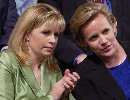 Cheney Proud of his Lesbian Daughter, at odds with Bush Administration[Right] Dick Cheney confers with daughters, Mary, left, who is lesbian, and Elizabeth, at the 2000 Republican convention. Mary is in charge of her father’s travel and appearances in the 2004 campaign. U.S. Vice-President Dick Cheney has spelled out his differences with President George W. Bush on the volatile issue of gay marriage while making his most revealing public comments yet about the sexual orientation of his lesbian daughter. Asked for his stand at a town hall meeting here, Cheney replied: "Lynne and I have a gay daughter, so it's an issue that our family is very familiar with ... my general view is that freedom means freedom for everyone. People ... ought to be free to enter into any kind of relationship they want to." That stands in stark contrast to Bush, who has endorsed amending the U.S. constitution to prevent states from recognizing such marriages, and to manoeuvring by Republican conservatives to include a constitutional ban on same-sex marriage and language opposing legal recognition of any gay civil unions in the 2004 election platform. In his speech Tuesday night, Cheney reiterated the position he outlined in the 2000 campaign — that same-sex marriage should be left to states to decide, but added: "The president makes basic policy for the administration. And he's made it." The Family Research Council, a conservative group with close White House ties, called Cheney's remarks disappointing. "Unfortunately, protection of our values is made more difficult when mixed messages emanate from the White House," said its president Tony Perkins. Bush officials said Cheney has such goodwill among conservatives that the White House isn't worried about political fallout. Mary Cheney works for the campaign as director of vice-presidential operations, responsible for her father's political travel and appearances. "We have two daughters, and we have enormous pride in both of them," Cheney said.