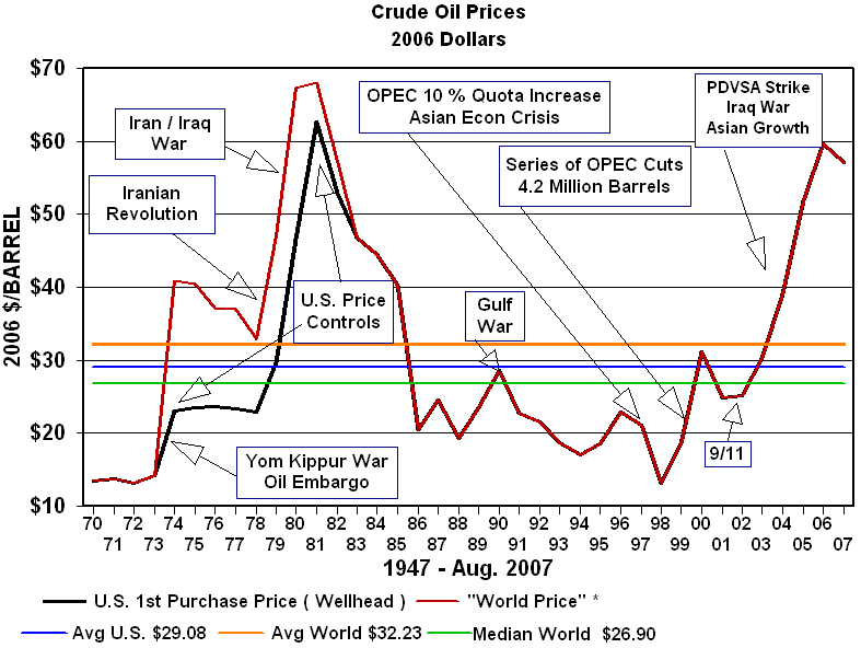 IntroductionCrude oil prices behave much as any other commodity with wide price swings in times of shortage or oversupply. The crude oil price cycle may extend over several years responding to changes in demand as well as OPEC and non-OPEC supply. The U.S. petroleum industry's price has been heavily regulated through production or price controls throughout much of the twentieth century. In the post World War II era U.S. oil prices at the wellhead averaged $24.20 per barrel adjusted for inflation to 2006 dollars. In the absence of price controls the U.S. price would have tracked the world price averaging $26.16. Over the same post war period the median for the domestic and the adjusted world price of crude oil was $18.53 in 2006 prices. That means that only fifty percent of the time from 1947 to 2006 have oil prices exceeded $18.53 per barrel. (See note in box on right.) Until the March 28, 2000 adoption of the $22-$28 price band for the OPEC basket of crude, oil prices only exceeded $24.00 per barrel in response to war or conflict in the Middle East. With limited spare production capacity OPEC abandoned its price band in 2005 and was powerless to stem a surge in oil prices which was reminiscent of the late 1970s.