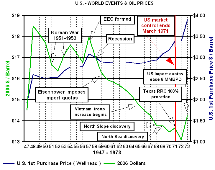 The Very Long Term ViewThe very long term view is much the same. Since 1869 US crude oil prices adjusted for inflation have averaged $21.05 per barrel in 2006 dollars compared to $21.66 for world oil prices. Fifty percent of the time prices U.S. and world prices were below the median oil price of $16.71 per barrel. If long term history is a guide, those in the upstream segment of the crude oil industry should structure their business to be able to operate with a profit, below $16.71 per barrel half of the time. The very long term data and the post World War II data suggest a "normal" price far below the current price. The results are dramatically different if only post-1970 data are used. In that case U.S. crude oil prices average $29.06 per barrel and the more relevant world oil price averages $32.23 per barrel. The median oil price for that time period is $26.50 per barrel. If oil prices revert to the mean this period is likely the most appropriate for today's analyst. It follows the peak in U.S. oil production eliminating the effects of the Texas Railroad Commission and is a period when the Seven Sisters were no longer able to dominate oil production and prices. It is an era of far more influence by OPEC oil producers than they had in the past. As we will see in the details below influence over oil prices is not equivalent to control.