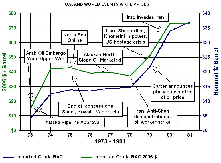 Yom Kippur War - Arab Oil EmbargoIn 1972 the price of crude oil was about $3.00 per barrel and by the end of 1974 the price of oil had quadrupled to over $12.00. The Yom Kippur War started with an attack on Israel by Syria and Egypt on October 5, 1973. The United States and many countries in the western world showed support for Israel. As a result of this support several Arab exporting nations imposed an embargo on the countries supporting Israel. While Arab nations curtailed production by 5 million barrels per day (MMBPD) about 1 MMBPD was made up by increased production in other countries. The net loss of 4 MMBPD extended through March of 1974 and represented 7 percent of the free world production. If there was any doubt that the ability to control crude oil prices had passed from the United States to OPEC it was removed during the Arab Oil Embargo. The extreme sensitivity of prices to supply shortages became all too apparent when prices increased 400 percent in six short months. From 1974 to 1978 world crude oil prices were relatively flat ranging from $12.21 per barrel to $13.55 per barrel. When adjusted for inflation the price over that period of time world oil prices were in a period of moderate decline.