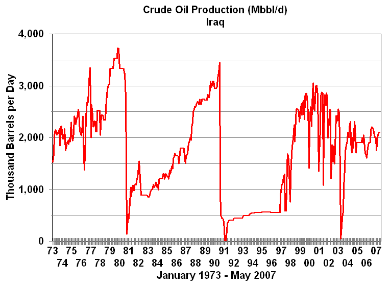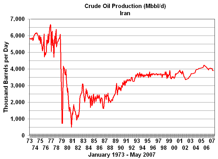 Crises in Iran and IraqEvents in Iran and Iraq led to another round of crude oil price increases in 1979 and 1980. The Iranian revolution resulted in the loss of 2 to 2.5 million barrels per day of oil production between November, 1978 and June, 1979. At one point production almost halted. While the Iranian revolution was the proximate cause of what would be the highest prices in post-WWII history, its impact on prices would have been limited and of relatively short duration had it not been for subsequent events. Shortly after the revolution production was up to 4 million barrels per day. Iran weakened by the revolution was invaded by Iraq in September, 1980. By November the combined production of both countries was only a million barrels per day and 6.5 million barrels per day less than a year before. As a consequence worldwide crude oil production was 10 percent lower than in 1979. The combination of the Iranian revolution and the Iraq-Iran War cause crude oil prices to more than double increasing from from $14 in 1978 to $35 per barrel in 1981. Twenty-six years later Iran's production is only two-thirds of the level reached under the government of Reza Pahlavi, the former Shah of Iran. Iraq's production remains about 1.5 million barrels below its peak before the Iraq-Iran War.