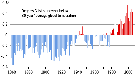 World Temperatures Keep Rising With a Hot 2005New international climate data show that 2005 is on track to be the hottest year on record, continuing a 25-year trend of rising global temperatures. Climatologists at NASA's Goddard Institute for Space Studies calculated the record-breaking global average temperature, which now surpasses 1998's record by a tenth of a degree Fahrenheit, from readings taken at 7,200 weather stations scattered around the world. The new analysis comes as government and independent scientists are reporting other dramatic signs of global warming, such as the record shrinkage of the Arctic sea ice cover and unprecedented high ocean temperatures in the Gulf of Mexico. Late last month, a team of University of Colorado and NASA scientists announced that the Arctic sea ice cap shrank this summer to 200 million square miles, 500,000 square miles less than its average area between 1979 and 2000. And a scientist at the National Oceanic and Atmospheric Administration determined that sea surface temperatures in the Gulf of Mexico were higher in August than at any time since 1890, which may have contributed to the intense hurricanes that struck the region this year. "At this point, people shouldn't be surprised this is happening," said Goddard atmospheric scientist David Rind, noting that 2002, 2003 and 2004 were among the warmest years on record. Many climatologists, along with policymakers in a number of countries, believe the rapid temperature rise over the past 50 years is heavily driven by the burning of fossil fuels and other human activities that have spewed carbon dioxide and other "greenhouse gases" into the atmosphere. A vocal minority of scientists say the warming climate is the result of a natural cycle. Rind compared the warming trend to what happens when a major league baseball team owner spends lavishly on players' salaries. Pumping heat-trapping gases into the atmosphere, he said, produces the same kind of predictable results as boosting a team's payroll. "When they get into the playoffs, should we be surprised?" he asked. "We're putting a lot more carbon dioxide into the atmosphere, and we're getting a lot higher temperatures." Global temperatures this year are about 1.36 degrees Fahrenheit (0.75 Celsius) above the average between 1950 and 1980, according to the Goddard analysis. Worldwide temperatures in 1998 were 1.28 degrees Fahrenheit (0.71 Celsius) above that 30-year average. The data show that Earth is warming more in the Northern Hemisphere, where the average 2005 temperature was two-tenths of a degree above the 1998 level. Climate experts say such seemingly small shifts are significant because they involve average readings based on measurements taken at thousands of sites. To put it in perspective, the planet's temperature rose by just 1 to 1.5 degrees Fahrenheit over the past century. Rind, who said it would probably take a major event such as a massive volcanic eruption to keep this year from setting a record, said that scientists expect worldwide temperatures to rise another degree Fahrenheit between 2000 and 2030, and an additional 2 to 4 degrees by 2100. From that perspective, this year's higher temperatures are "really small potatoes compared to what's to come," he said. But one skeptic, state climatologist George Taylor of Oregon, said it is difficult to determine an accurate global average temperature, especially since there are not enough stations recording ocean temperatures. "I just don't trust it," Taylor said of the new calculation, noting that Goddard's findings are "mighty preliminary." Several scientists said yesterday that Earth's rapid warming could become self-perpetuating as the buildup of heat in the air, on land and in the sea accelerates. Ted A. Scambos, the lead scientist at the National Snow and Ice Data Center in Boulder, Colo., said the shrinkage of sea ice in the Arctic makes it more likely that the region will warm faster, because open water absorbs much more heat from the sun than snow and ice. "Change is really happening in the Arctic. We're going to see this again and again," Scambos said. He added that, because the Arctic helps keep global temperatures down, any warming there can mean "you're going to change [the world's] climate significantly." In response to recent warming in the Arctic, a coalition of environmental groups said it plans to sue the Interior Department to force it to list polar bears as threatened under the Endangered Species Act because the sea ice they depend on is disappearing. The Natural Resources Defense Council, the Center for Biological Diversity and other groups petitioned for the listing in February, but they say Interior Secretary Gale A. Norton has yet to respond. "The polar bear's a harbinger of what's to come. It's the first animal to be threatened with extinction by climate change, but it won't be the last," said NRDC attorney Andrew Wexler. He noted that polar bears cannot adapt well to rising temperatures because they are dependent on sea ice for survival. U.S. Fish and Wildlife Service spokesman Chris Tollefson said the agency is analyzing the petition. "We haven't really reached a conclusion," Tollefson said. The Bush administration has consistently advocated funding for technological research rather than requiring curbs in carbon dioxide emissions, saying that such limits could damage the economy. William O'Keefe, chief executive of the George C. Marshall Institute, which is skeptical of global warming predictions, said policymakers should not rush to impose new rules on industry when it remains unclear whether the current warming worldwide reflects natural climate variability or a human-induced trend. "It still remains very complicated," O'Keefe said. But Rafe Pomerance, who served as deputy assistant secretary of state for the environment under President Bill Clinton and who now chairs the bipartisan Climate Policy Center, said a modest system to limit and trade carbon dioxide em
