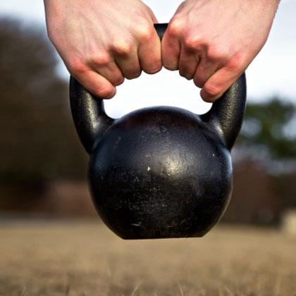 Choose a kettlebell you are comfortable swinging and try this circuit, created by Jenn Nims of Girl-Heroes. 2-3 times. Do each move for 40 seconds, resting for 20 seconds between moves. Complete the entire circuit 2-3 times. (You can see a video demonstration of the moves here.)