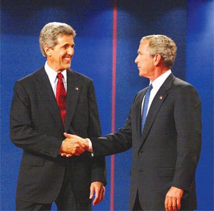 "It's been a little tough to prepare for the debates, because he keeps changing his positions, especially on the war. I think he could spend 90 minutes debating himself." - George W. Bush.