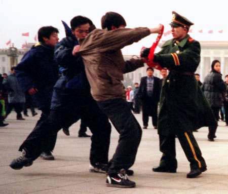 Thanks to China's growth in capitalism and economic strength more students are able to access the internet than ever before, and they're learning about what happened during the June 4th 1989 massacre, which they colloquially refer to now as "6-4." Thanks to a higher rate of English foreigners flooding China there is also a lot more people learning about the massacre which has been ignored in China's history books. Some Chinese, raised on a diet of Communist party propaganda and nationalism, don't believe the information about the massacre, thinking it to be some kind of hoax. But for those who do believe and democracy advocates it's a dangerous challenge to the Communist Party's monopoly over information, many of whom security police have been periodically arrested, intimidated and told to stay silent. Every year people gather at the windswept Tiananmen Square, which sits docked at the mouth of the Forbidden City, and every year a few groups of young people attract the attention of police for trying to post a banner remembering the event in 1989.