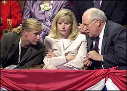 Cheney Proud of his Lesbian Daughter, at odds with Bush Administration[Right] Dick Cheney confers with daughters, Mary, left, who is lesbian, and Elizabeth, at the 2000 Republican convention. Mary is in charge of her father’s travel and appearances in the 2004 campaign. U.S. Vice-President Dick Cheney has spelled out his differences with President George W. Bush on the volatile issue of gay marriage while making his most revealing public comments yet about the sexual orientation of his lesbian daughter. Asked for his stand at a town hall meeting here, Cheney replied: "Lynne and I have a gay daughter, so it's an issue that our family is very familiar with ... my general view is that freedom means freedom for everyone. People ... ought to be free to enter into any kind of relationship they want to." That stands in stark contrast to Bush, who has endorsed amending the U.S. constitution to prevent states from recognizing such marriages, and to manoeuvring by Republican conservatives to include a constitutional ban on same-sex marriage and language opposing legal recognition of any gay civil unions in the 2004 election platform. In his speech Tuesday night, Cheney reiterated the position he outlined in the 2000 campaign — that same-sex marriage should be left to states to decide, but added: "The president makes basic policy for the administration. And he's made it." The Family Research Council, a conservative group with close White House ties, called Cheney's remarks disappointing. "Unfortunately, protection of our values is made more difficult when mixed messages emanate from the White House," said its president Tony Perkins. Bush officials said Cheney has such goodwill among conservatives that the White House isn't worried about political fallout. Mary Cheney works for the campaign as director of vice-presidential operations, responsible for her father's political travel and appearances. "We have two daughters, and we have enormous pride in both of them," Cheney said.