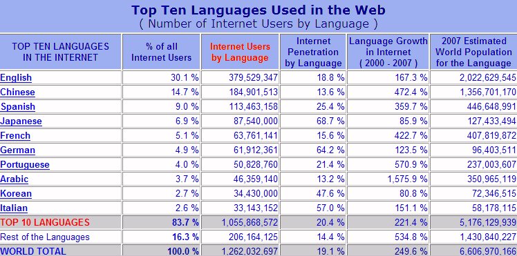 World Statistics of Internet Growth By Charles Moffat - February 2008. Only 19.1% of the world has access to the internet and knows how to use it. That means there is a lot of potential for growth out there during the 21st century, but just how fast is it growing? Well, in English speaking countries only 18.8% of the population uses the internet. In Japan it is 68.7% and for German speakers it is 64.2%. So apparently English speakers are not using the internet as much as they could be. Other languages that are far ahead of English are Spanish (25.4%), Korean (47.6%) and Italian (57.0%). See the full stats at the bottom of this page. In North America approx. two thirds of the population has access to the internet at either work or home. So in some countries the internet (and computer use in general) is really popular but in North America/Britain we have barely even begun. Why is this?